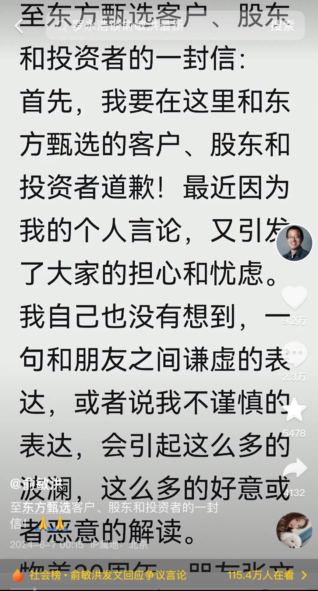 不过,在这封深夜道歉信里,俞敏洪并未提及直播间问题,只是对东方甄选客户、股东和投资者致歉并解释,之所以会说那句话,既是“习惯表达”的自谦,也是激励自己与同仁,要把不完美的东方甄选做得更好。
