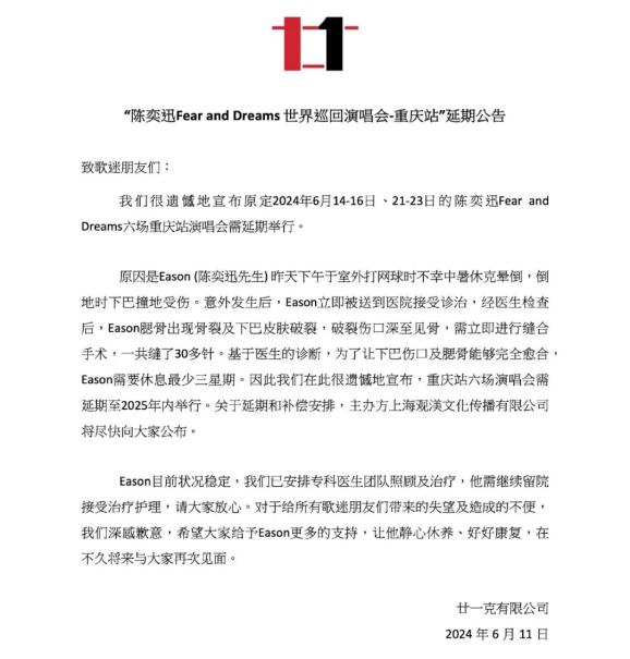 6月11日,陈奕迅方发布演唱会重庆站延期公告,称陈奕迅因打网球中暑休克晕倒,导致下巴撞地受伤。