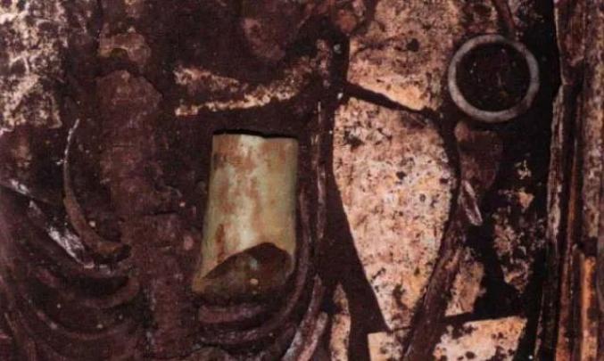 N16M4(牛河梁遗址第16地点4号墓)玉冕和玉镯的出土状态