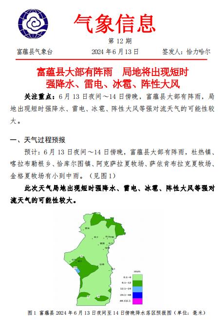 强对流天气是指突然发生在局地、天气剧烈、生命史短、但破坏力却极大的灾害性天气。多发生在春、夏、秋三季,夏季是强对流天气的高发季节。富蕴旅游温馨提示您:原标题:《【富蕴天气】天气预报》