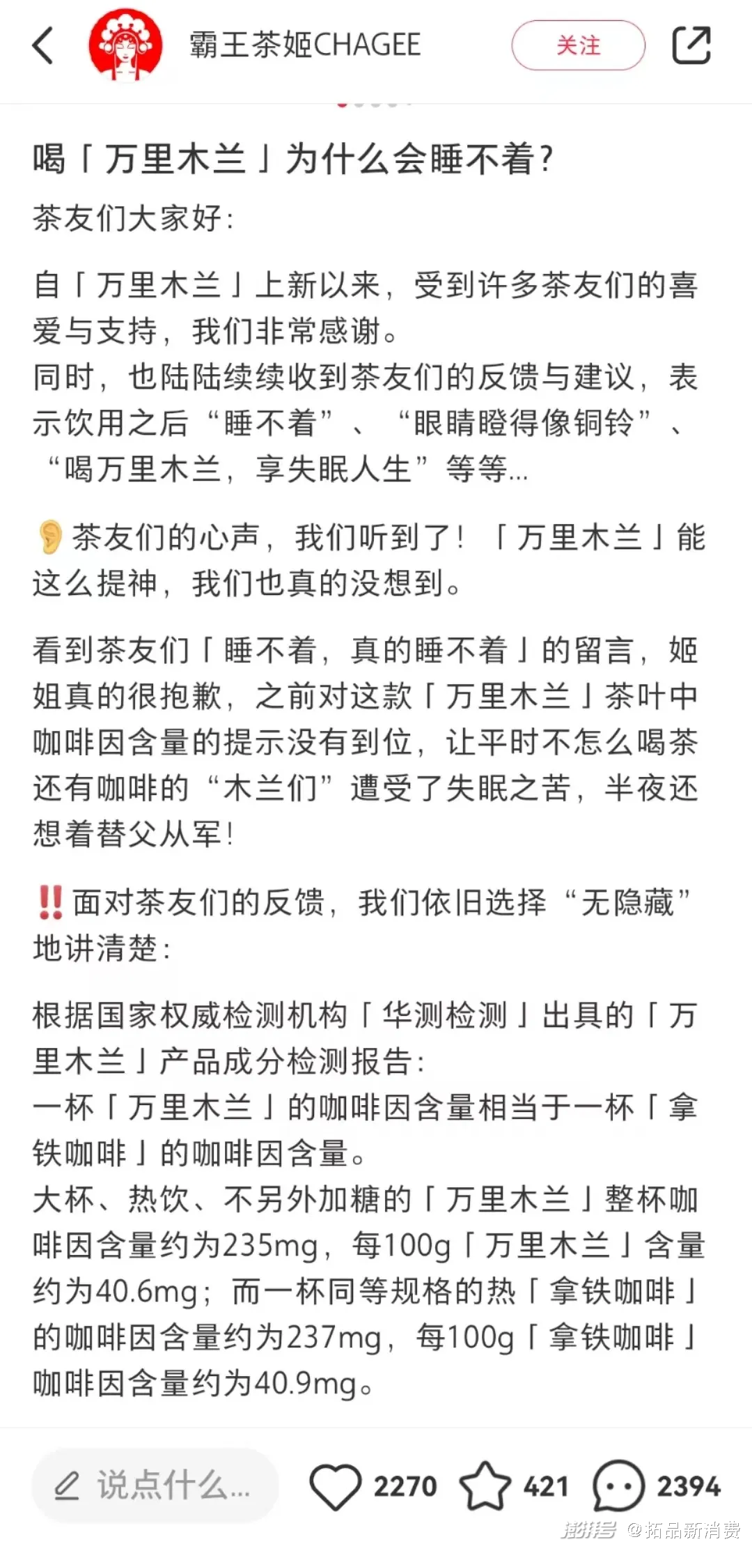 为此,霸王茶姬也专门发布了一条“关于为什么喝了万里木兰会睡不着”的笔记并置顶,文中解释道因为一杯万里木兰相当于一杯拿铁咖啡的咖啡因,势必会让不怎么喝咖啡的人失眠。