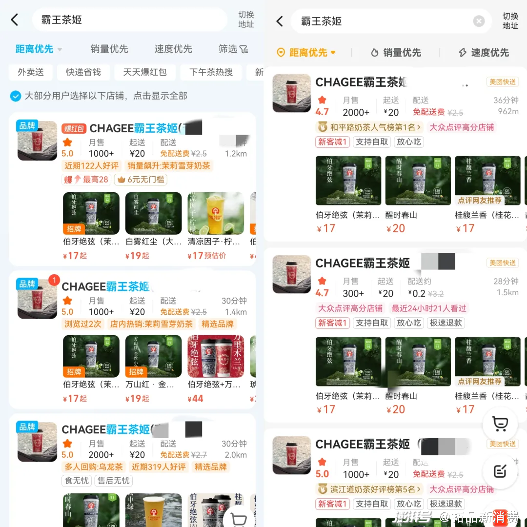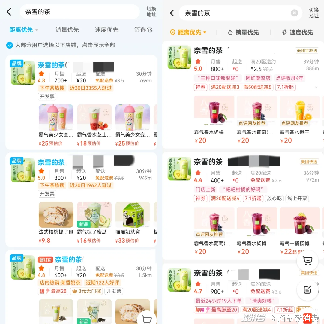 拓品新消费同样以某一线城市交通枢纽位置为圆心,将三种品牌距离最近的三家门店在饿了么和美团上显示的销量进行了综合对比。数据显示,霸王茶姬最近的三家门店累计月销量7300+,奈雪的茶最近三家门店在两个渠道累计销量为3700+,而喜茶则因为仅在自家的喜茶go小程序上线,没有可参考的数据。