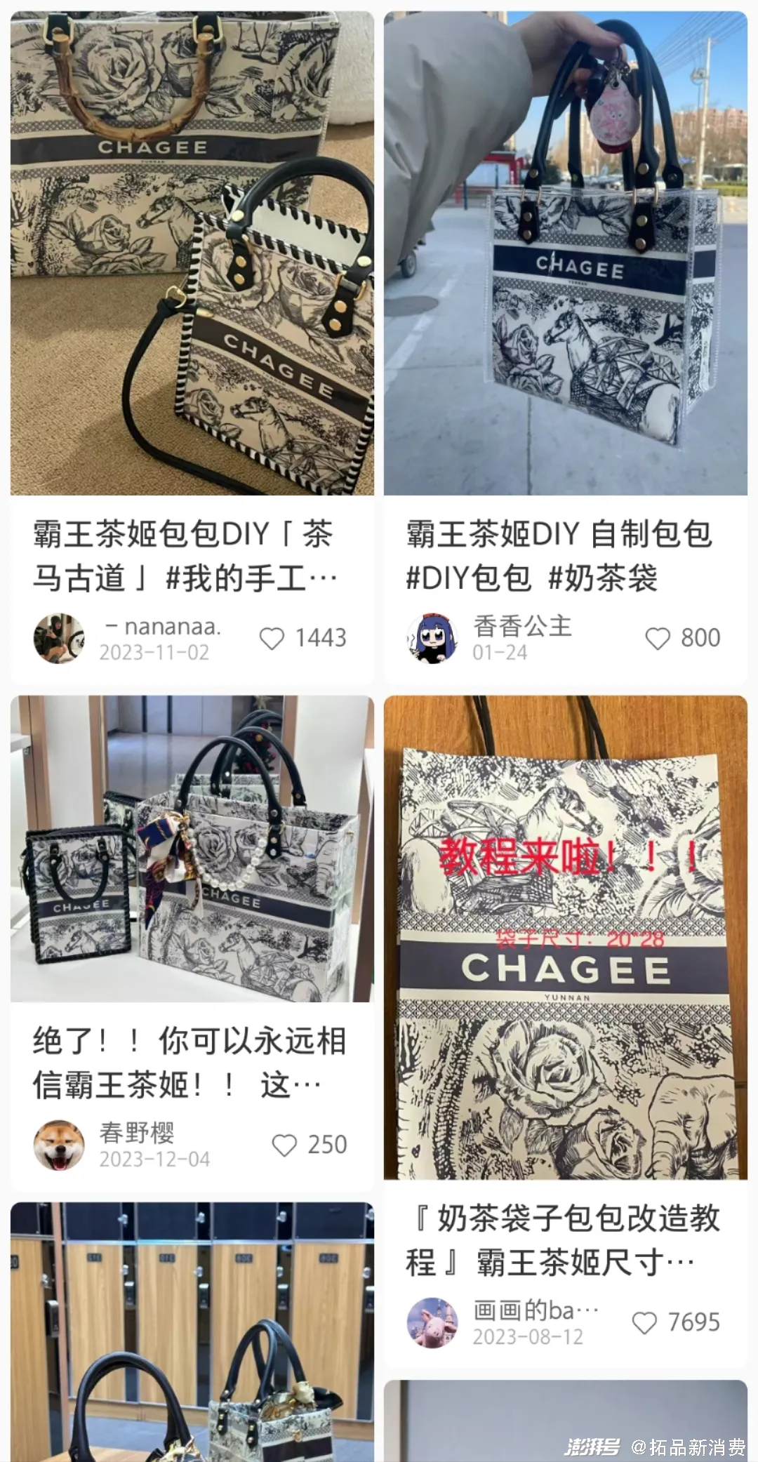 在小红书、抖音等社交平台上搜索霸王茶姬就能看到,除了新品试喝的流量内容外,许多用户将霸王茶姬的包装袋进行了DIY改装,或是做成了果冻包,或是做成了笔筒,并将其称为“0成本拿下Dior包袋”。
