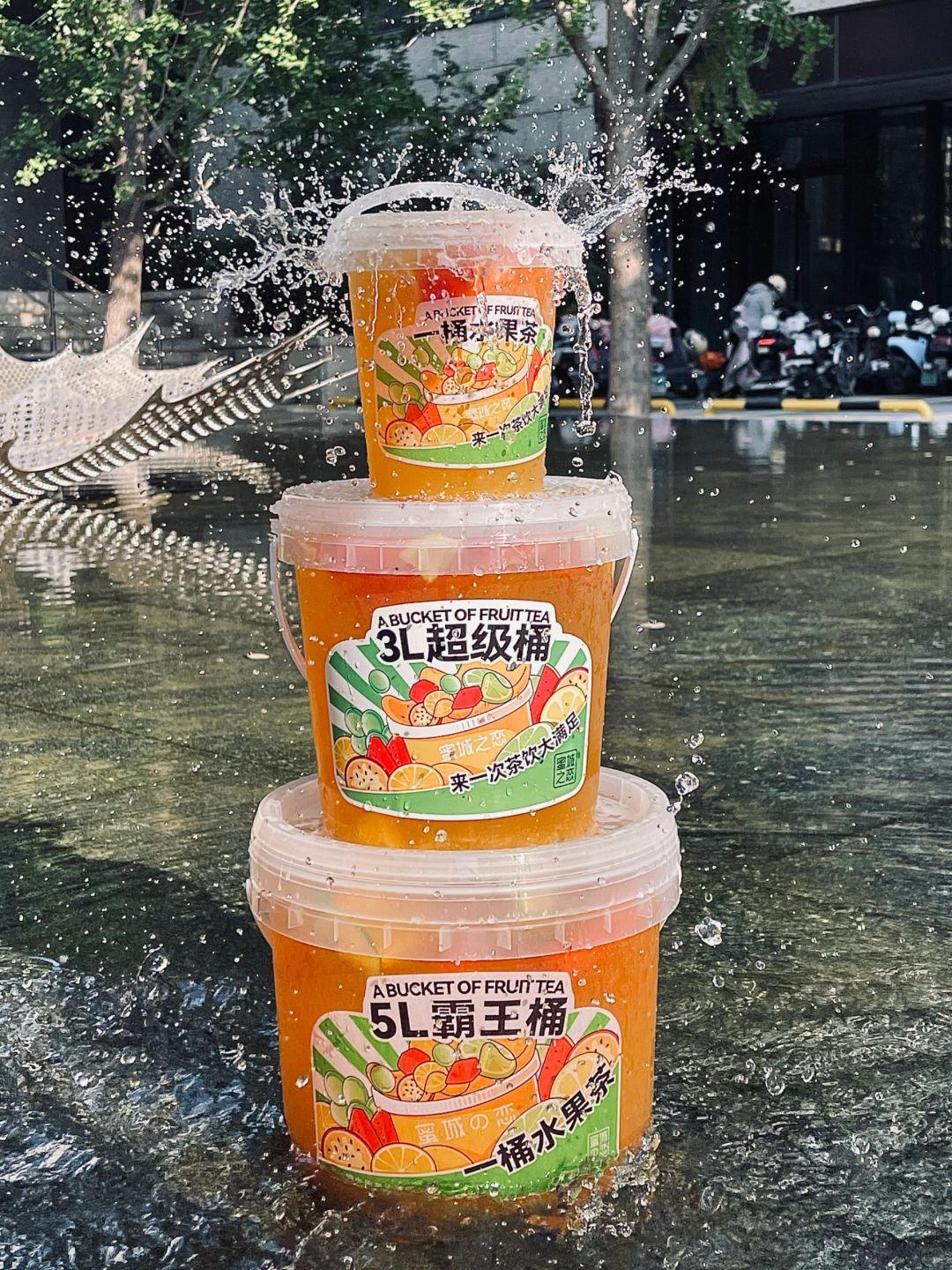 徐州本土的奶茶品牌蜜城之恋曾推出过最大5L的水果茶,喝完还能拿来当泡脚桶/图源:蜜城之恋在成为网红之前,桶装饮品也曾断断续续在社交平台上引发热议。