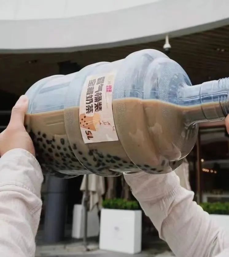 奈雪的茶曾推出5L装“霸气桶装宝藏奶茶”,限时限地限量,售价99元/桶,据说珍珠和奶茶用量是正常杯装的10倍。