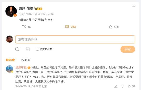 “哪吒是个好品牌名字!“他在微博上说。