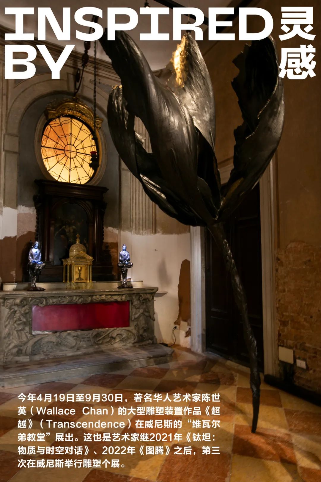 陈世英个展《图腾》展览现场陈世英在威尼斯的前两次展览均设在大运河畔的15世纪建筑Fondaco Marcello。今年的作品《超越》则设在慈悲圣母教堂,俗称“维瓦尔弟教堂”,因这位威尼斯音乐家在这里创作了许多举世闻名的音乐作品而得名。陈世英创作了四件钛金属雕塑作品,依次悬挂于教堂中央,以冬、春、夏、秋的顺序,向维瓦尔第的《四季》致敬。
