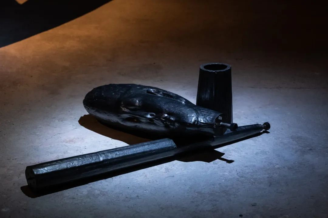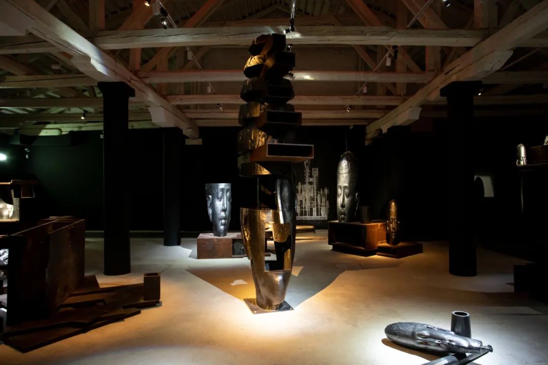 陈世英个展《钛坦:物质与时空对话》展览现场2022年,陈世英带着《图腾》重回威尼斯,作品灵感来源于原始时代神灵的载体。展览由一件高达10米的大型钛金属雕塑的部件组成,散落分布在展厅内。陈世英在采访时告诉记者,如此设计是为了让观者走入其中,将观者的身体也代入雕塑,成为物质的一部分,以此发掘雕塑物质的内在灵性。这亦是陈世英个人哲学观的体现。