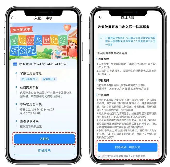 03 开始网上报名点击【去报名】,了解办理须知,如办理条件、申办时间、注意事项等信息。了解并确认后,勾选“我已知悉并同意授权个人证件及信息”,点击【同意授权,刷脸认证】。