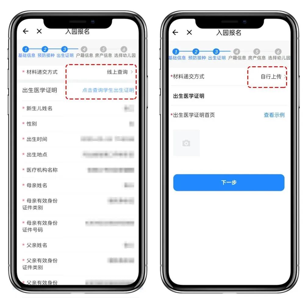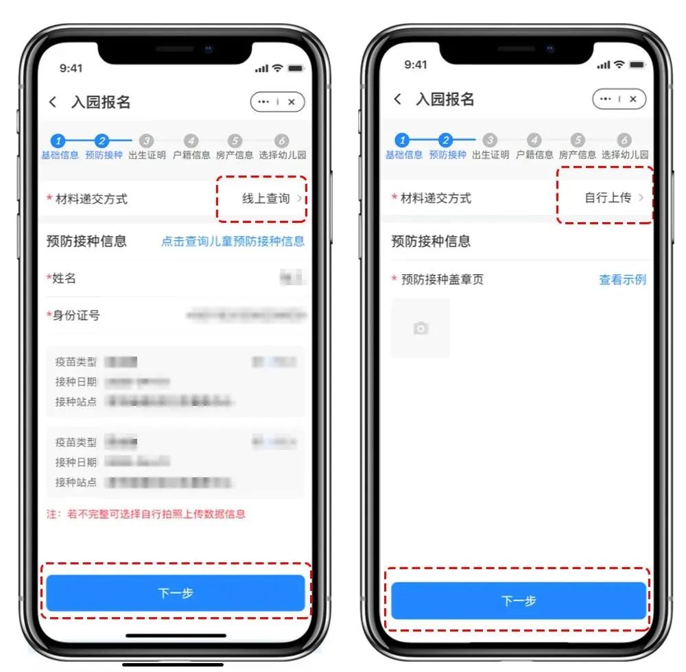05 添加预防接种信息“入园一件事”已打通公安、医疗等多项民生信息。添加预防接种信息时,可点击【线上查询】,自动填写数据。如信息不能自动查询或查询有误,可选择【自行上传】,“查看示例”后,点击“相机”按钮,拍摄证件原件上传,或调取相册图片上传。