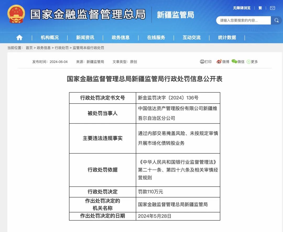因通过内部交易掩盖风险、未按规定审慎开展市场化债转股业务,信达资产新疆分公司被处以110万元的罚款;公司时任副总经理柏晓东,时任业务四处负责人、业务二处负责人、总经理助理李勇,均被警告,并分别罚款6万元、7万元。5月31日,国家金融监督管理总局发布的3份行政处罚信息公开表,均与信达资产有关。