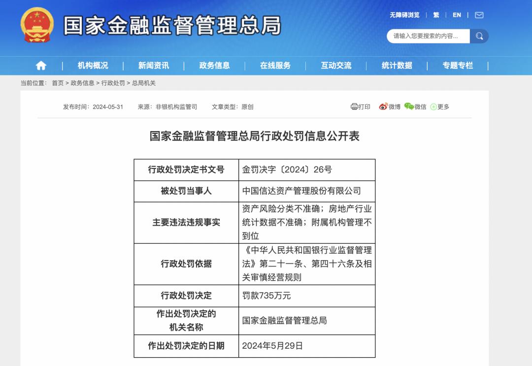 据披露,因存在资产风险分类不准确、房地产行业统计数据不准确、附属机构管理不到位等情形,信达资产被罚款735万元。同时,信达资产时任风险管理部总经理袁良明、时任首席风险官罗振宏对资产风险分类不准确行为负有责任,均被处以警告。