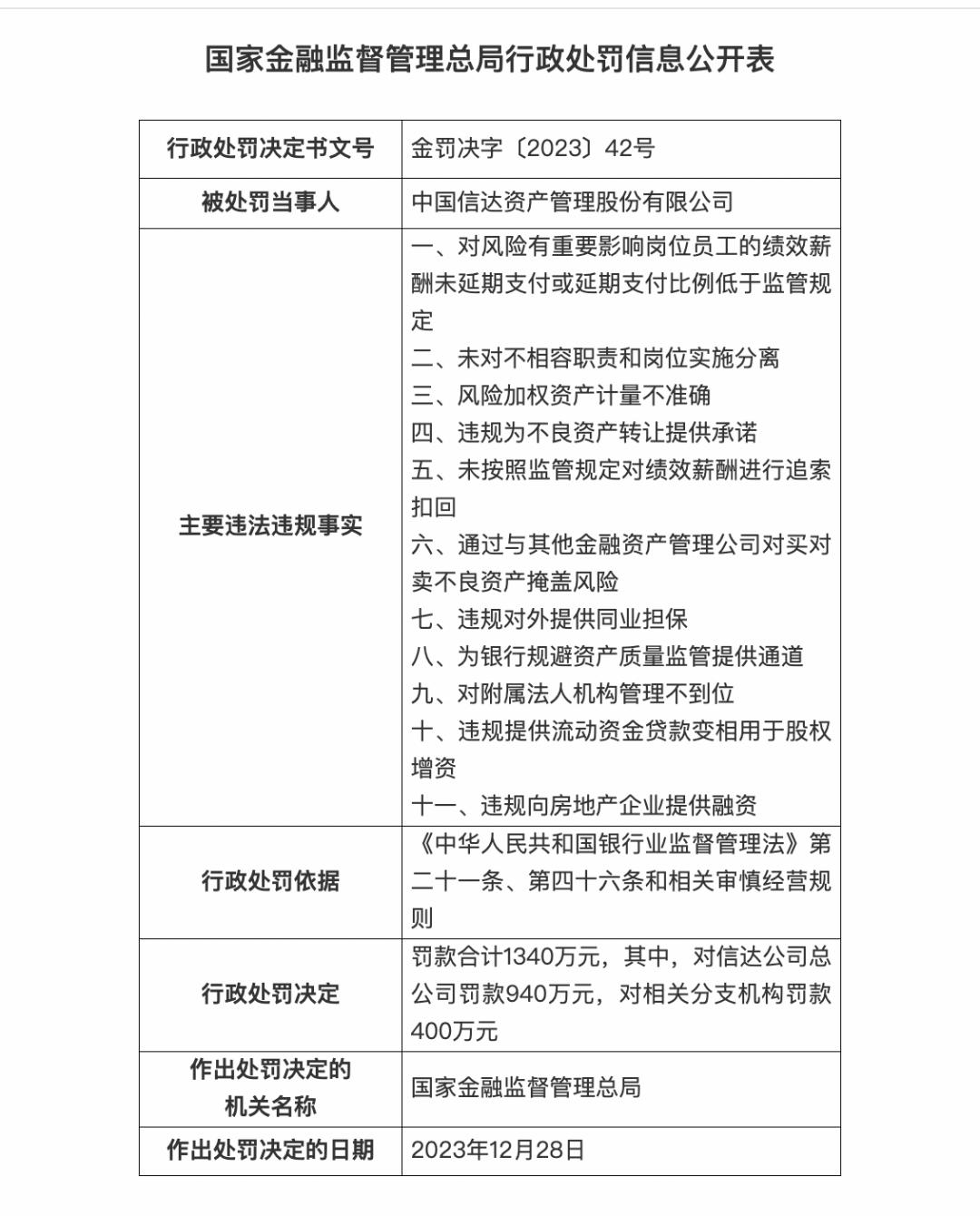 去年年底,该总局机关针对信达资产、旗下分公司及多名高管发布处罚信息公开表,总罚款合计1340万元,其中,对信达总公司罚款940万元,对相关分支机构罚款400万元。经披露,信达资产存在多达11项违规事实:一、对风险有重要影响岗位员工的绩效薪酬未延期支付或延期支付比例低于监管规定;二、未对不相容职责和岗位实施分离;三、风险加权资产计量不准确;四、违规为不良资产转让提供承诺;五、未按照监管规定对绩效薪酬进行追索扣回;六、通过与其他金融资产管理公司对买对卖不良资产掩盖风险;七、违规对外提供同业担保;八、为银行规避资产质量监管提供通道;九、对附属法人机构管理不到位;十、违规提供流动资金贷款变相用于股权增资;十一、违规向房地产企业提供融资。