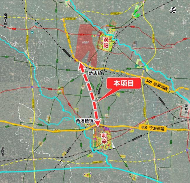 项目线路起自涡阳县楚店镇西侧接在建亳蒙高速,而后向南在纪王场乡与江集镇之间穿越,避让风力发电机组,后与S310交叉设置江集互通,继续向东南上跨青阜铁路,在既有利辛互通西侧接G36宁洛高速,全长约28公里。全线共设置3处互通立交,其中2处枢纽互通,1处一般互通。项目拟采用双向四车道高速公路标准,路基宽度27米。