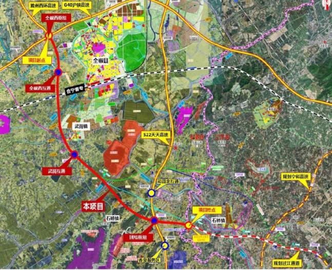 项目路线起于G40沪陕高速与S98滁州支线高速交叉处,向南跨越襄河、S326、合宁客专,在武岗镇北侧与S210交叉后,路线折向东,经过椒陵新城,跨越荒草三圩和滁河,在绰庙社区北侧与天天高速交叉,在石杨镇大武村附近终于皖苏省界,顺接禄口至全椒高速江苏段,线路总长约22.3公里。全线设置互通立交4处,其中枢纽互通2处、服务型互通2处。双向六车道高速公路标准,设计速度120公里/小时。