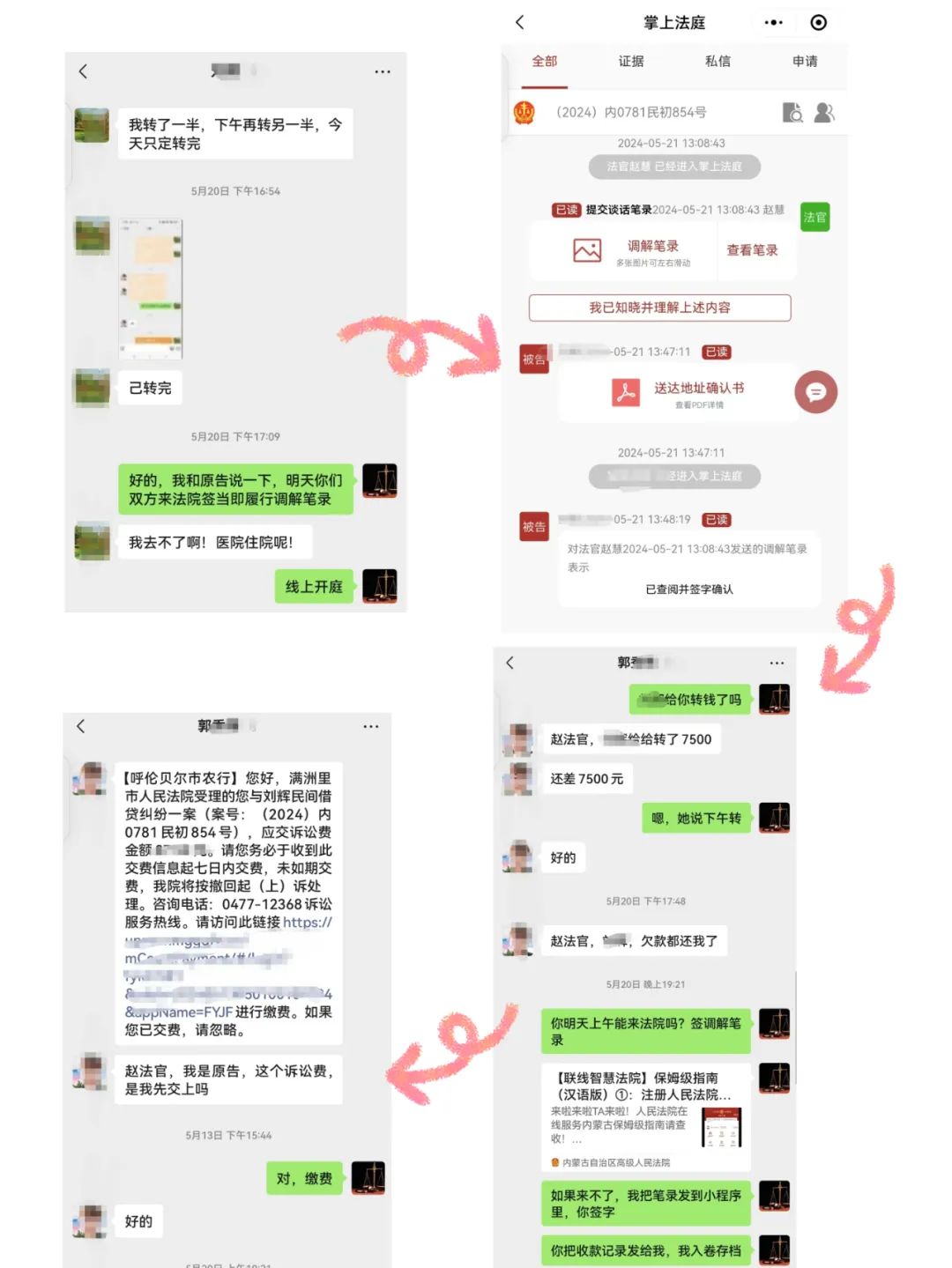 为了督促被告刘某按时履行还款承诺,法官在这七天里对被告刘某进行了多次提醒和督促,被告刘某最终按照承诺通过微信转账履行了给付义务,法官组织双方通过人民法院在线服务平台签订了当即履行的调解笔录。