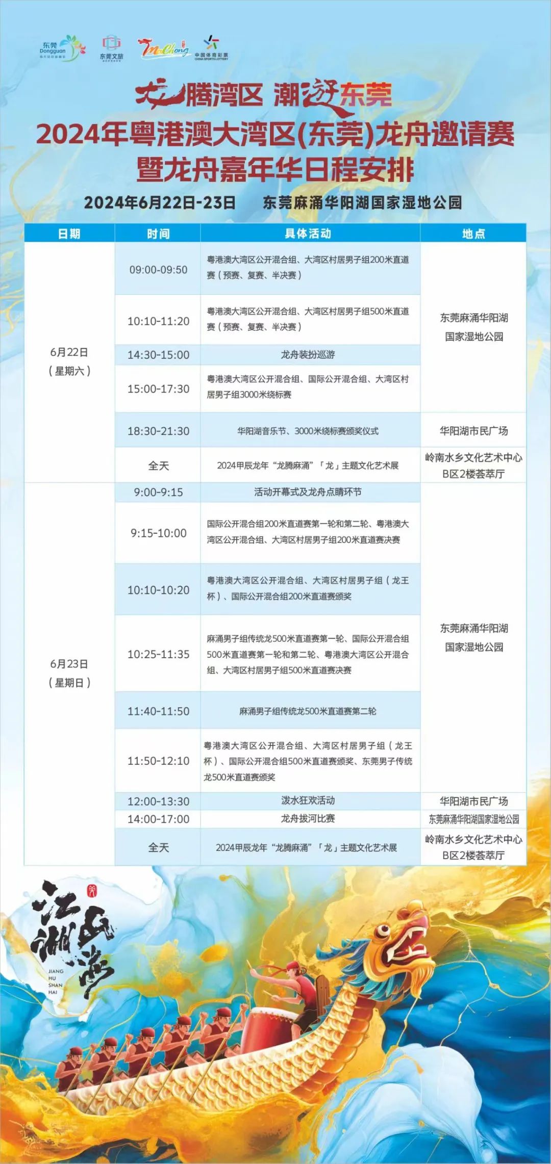 6月22日—23日,“龙腾湾区·潮游东莞”2024年粤港澳大湾区(东莞)龙舟邀请赛暨龙舟嘉年华将在东莞麻涌华阳湖国家湿地公园举办。