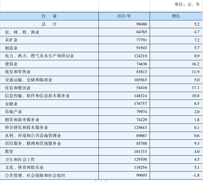 (五)城镇非私营单位在岗职工年平均工资为99,480元,各行业城镇非私营单位在岗职工年平均工资如下: