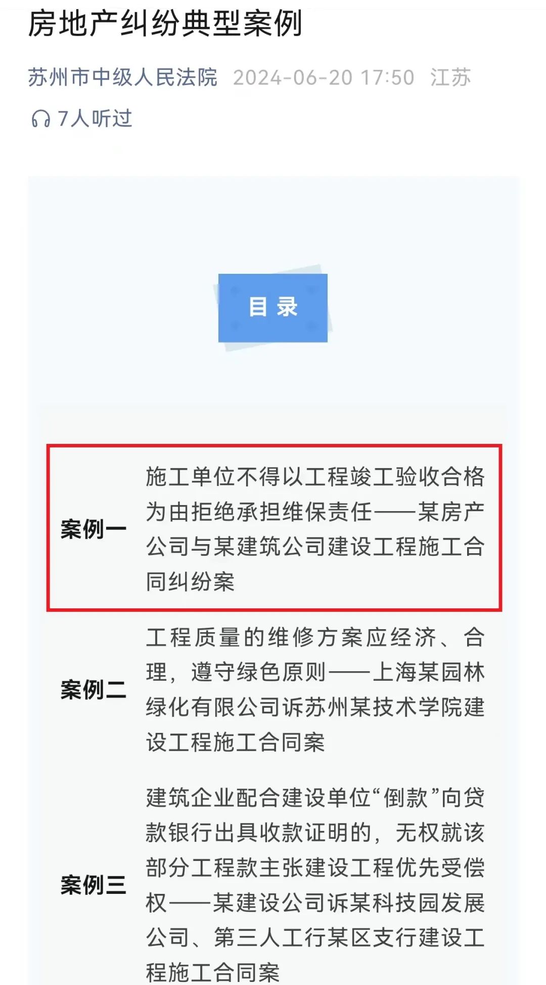 喜苏州市中级人民法院发布8件全市法院房地产纠纷典型案例。我院一起案例《施工单位不得以工程竣工验收合格为由拒绝承担维保责任——某房产公司与某建筑公司建设工程施工合同纠纷案》入选。