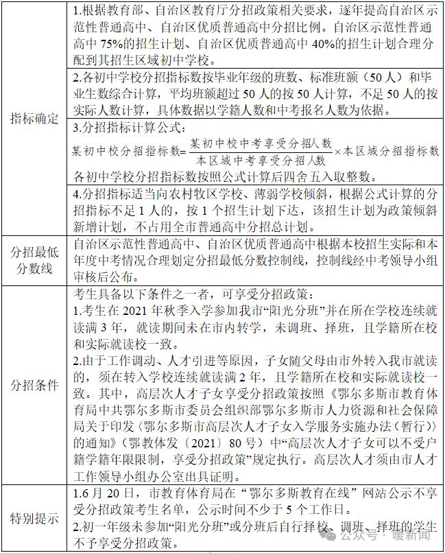 (二)根据《鄂尔多斯市教育体育局关于印发〈鄂尔多斯市高中阶段学校考试招生制度改革实施方案〉的通知》(鄂教体发〔2023〕15号),自治区示范性普通高中75%的招生计划、自治区优质普通高中40%的招生计划合理分配到其招生区域初中学校。(2023年该2项比例分别为70%、35%)