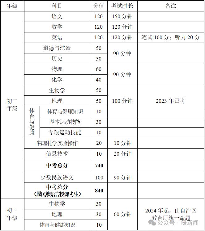 1.2024年起,初二年级生物学、地理、体育与健康知识学业水平考试由自治区教育厅统一命题,分值分别为30分、30分、10分。