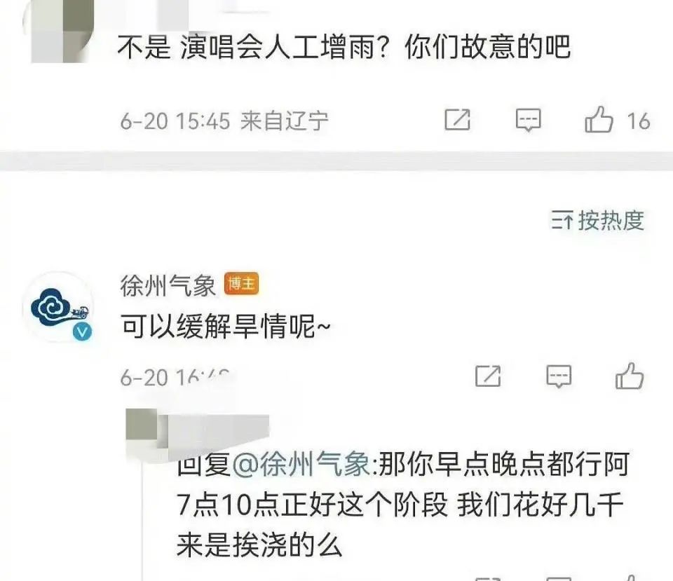 由于6月21日至23日薛之谦在徐州奥体中心有三场演唱会,很多粉丝对21日当晚的降雨表示不满,甚至在徐州气象微博下开怼,指责气象部门故意为之,并质疑为什么不能开完演唱会再增雨等。尽管气象部门已积极回应,但有些粉丝仍不依不饶喊话、抱怨,认为自己花几千元好不容易抢到票,结果来了就挨浇。