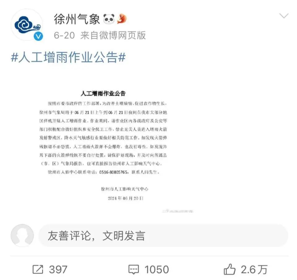 网友评论截图根据徐州市人工影响天气中心6月20日发布的人工增雨作业公告,为改善土壤墒情、促进农作物生长,徐州市气象局于6月21日上午到夜间在徐州大部分地区择机开展人工增雨作业。“我们昨天(21日)是分为7个作业组,每个作业组发射了4枚增雨火箭弹,我们的作业时间基本上是在午后1点到3点左右。”闫伍光介绍,受冷暖空气共同影响,21日中午到夜里徐州有一次较明显降水过程,根据旱情发展和抗旱需要,徐州市气象局抓住此次降雨时机,在全市组织实施了多点多次人工增雨作业。