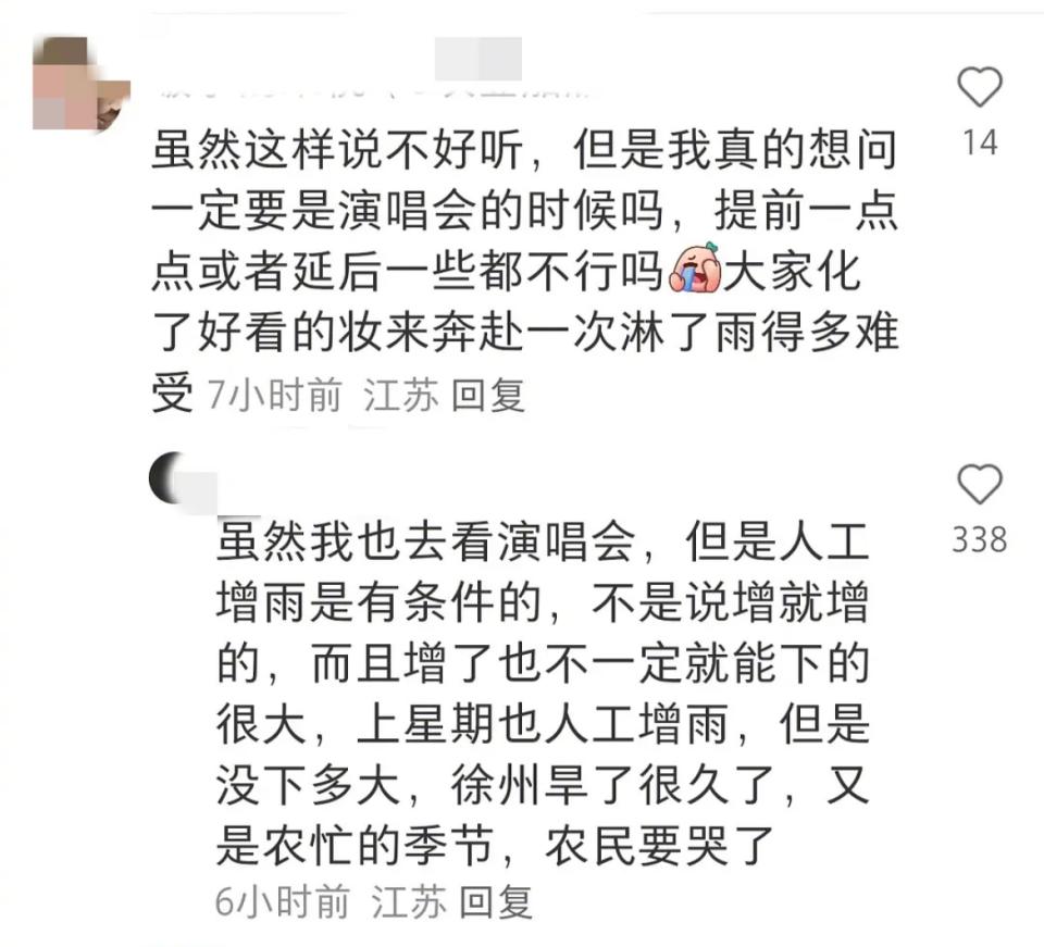 网友评论截图也有很多网友留言表示,徐州旱了很久,降雨也要考虑云量等各方面因素。“知道徐州等这场雨等了多久吗?”“我也去看了演唱会,人工增雨是有条件的,不是说增就增的,上星期也人工增雨,但是没下多大,徐州旱了很久了,又是农忙季节,农民要哭了。”“快快下,老百姓都盼着这个雨半年了。”