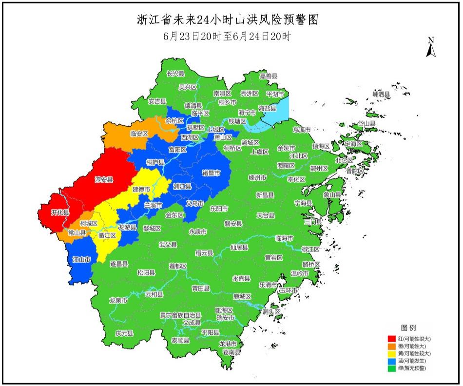 根据省气象台未来降雨预报,预计06月23日20时至06月24日20时,淳安县、开化县发生山洪灾害可能性很大(红色预警),临安区、常山县发生山洪灾害可能性大(橙色预警),建德市、柯城区、衢江区发生山洪灾害可能性较大(黄色预警),萧山区、余杭区、富阳区、桐庐县、诸暨市、浦江县、兰溪市、义乌市、龙游县、江山市可能发生山洪灾害(蓝色预警)。