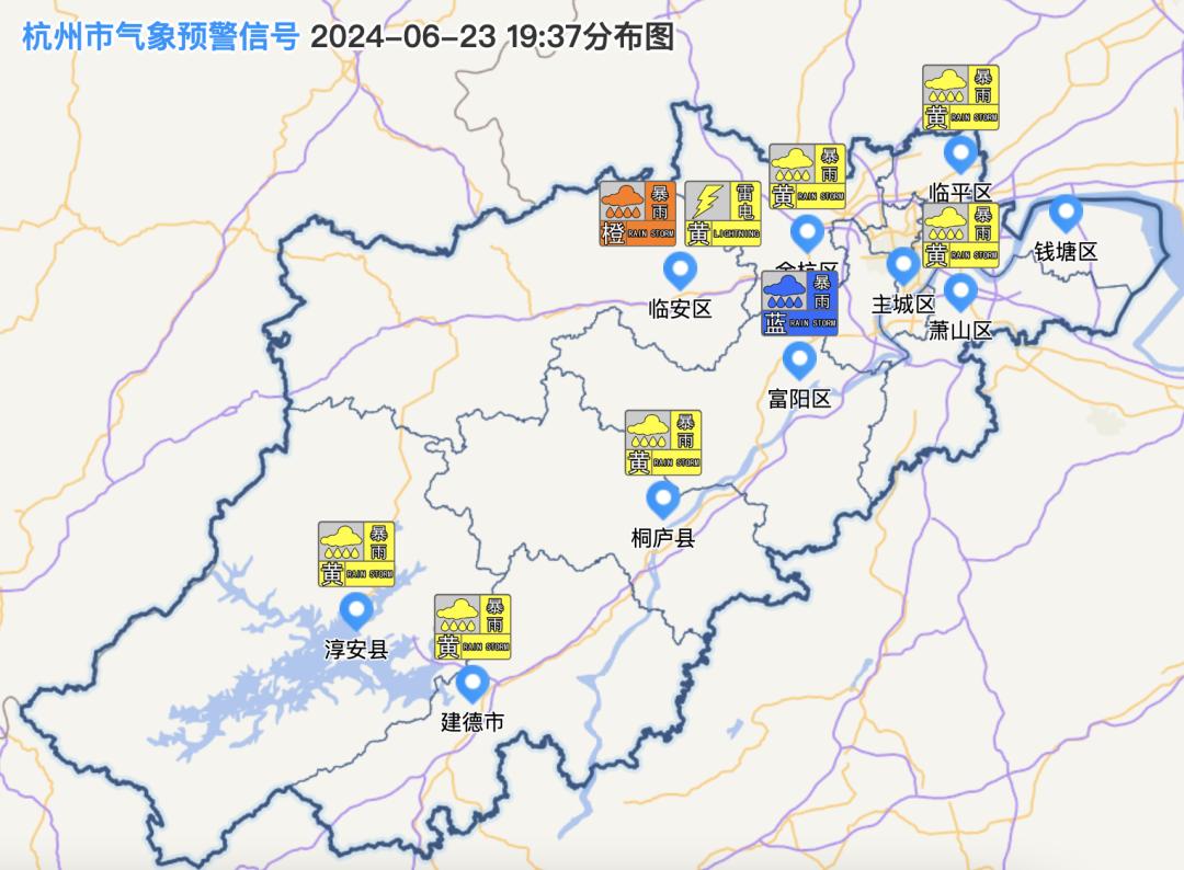 目前生效暴雨预警信号:临安暴雨橙色预警,淳安、桐庐、萧山、余杭、临平、建德暴雨黄色预警。富阳暴雨蓝色预警。