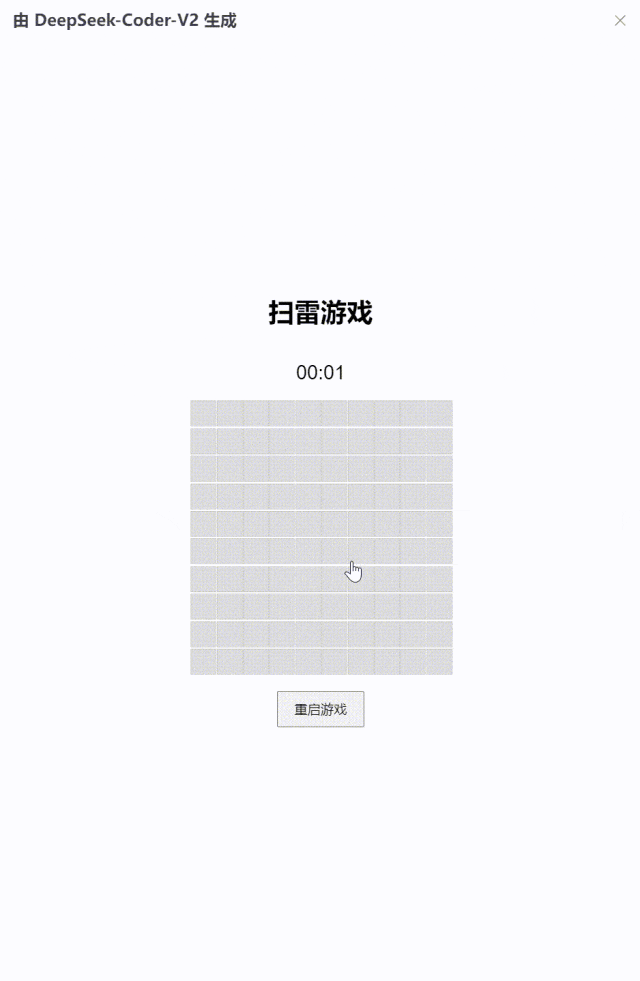 而且就在Claude 3.5 Sonnet发布同日,深度求索官网的代码助手也第一时间上线了和“Artifacts”类似的功能(自动生成代码并直接在浏览器上运行)。比如由DeepSeek-Coder-v2直接生成经典游戏——扫雷。