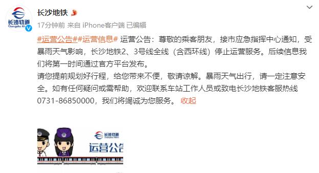 6月24日上午11时44分,长沙地铁发布运营公告称,接市应急指挥中心通知,受暴雨天气影响,长沙地铁2、3号线全线(含西环线)停止运营服务。后续信息,长沙地铁将第一时间通过官方平台发布。长沙地铁提醒乘客,提前规划好行程,暴雨天气出行,请注意安全。乘客如有任何疑问或需帮助,可联系车站工作人员或致电长沙地铁客服热线0731-86850000。