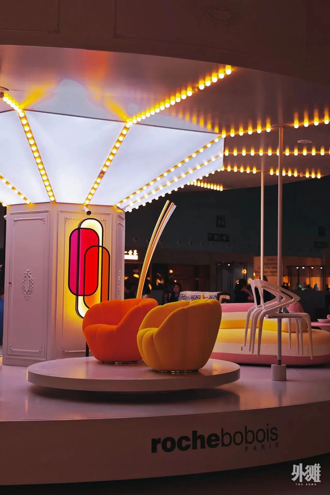 从经典不朽的Mah Jong 沙发到线条流畅的 Ava 椅,从设计感十足的 Astrea 扶手椅到自由组合的 Bombom 沙发,再到梦幻轻盈的 Bubble 沙发和功能与美学兼具的Legend书架。在本届展会上,罗奇堡不仅带来了标志性的家具作品,更以一种前所未有的方式,赋予了旋转木马全新的生命力和意义。