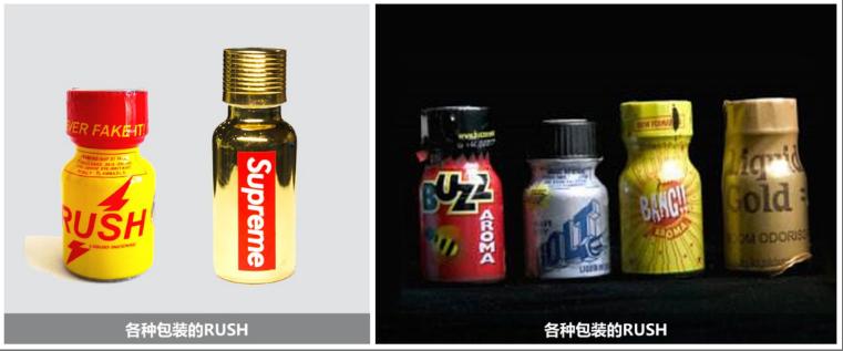 外观特点:瓶装液体,气味类似汽油,内部有小珠,摇时能听到响声,通常标有“Rush”“Poppers”等字样。主要成分:以亚硝酸异丁酯为代表的多种亚硝酸酯类新精神活性物质。