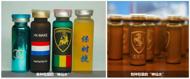 外观特点:形态与口服液类似,常标注各种名牌奢侈品商标。主要成分:非法制造的随意性较大,通常含有氯胺酮,同时还可能存在冰毒、摇头丸、曲马多等多种毒品成分。
