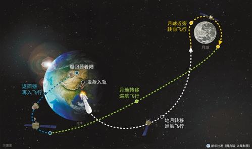 航天器从月球轨道返回地球的示意图(图片来源:新华社)最后,轨返组合体预计在距离地球5000公里的位置解锁分离,轨道器实施规避机动,返回舱则继续前行,大约在距离地面120公里的位置进入地球大气层,经过气动减速、滑行等一系列程序后,最终着陆在预定区域。