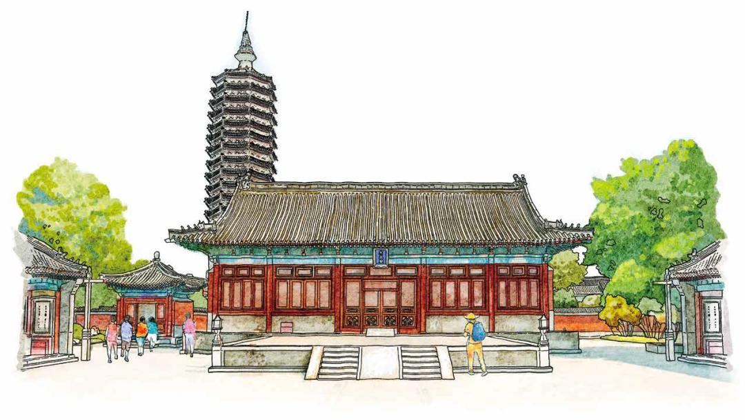 我们现在看到被“封神”级别的古建寺院园林等,其实是历代岁月叠加的美。比如这大雄宝殿的木构架和门窗彩绘,是明代原物;匾额是清乾隆御笔;后面龙潭螭首的石雕是金代遗物;舍利塔的造型是藏传佛教覆钵式白塔,塔旁的松柏有五百年以上了,山门又是20 世纪90 年代重修的。