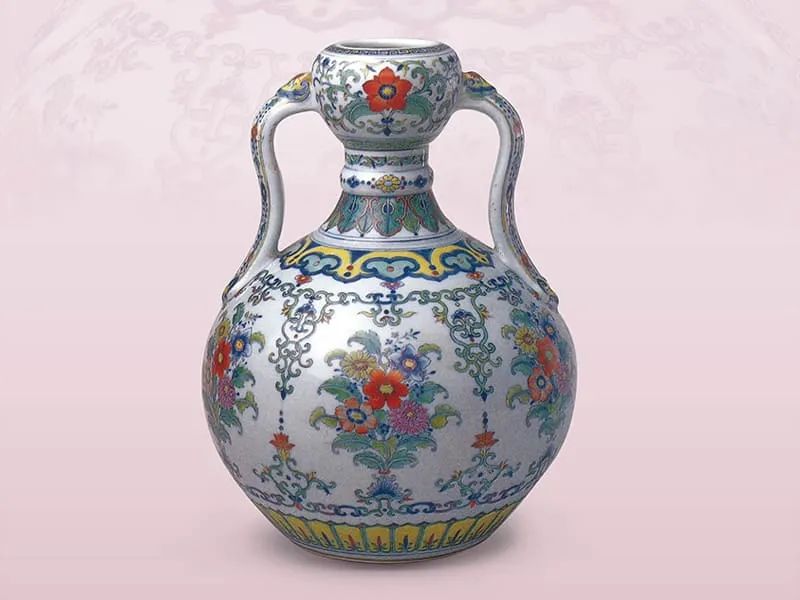 清雍正 · 斗彩双耳如意蒜头瓶雍正斗彩的纹饰融入了粉彩的彩料,红色、黄色及绿色等颜色质感与传统斗彩不同。(图一)