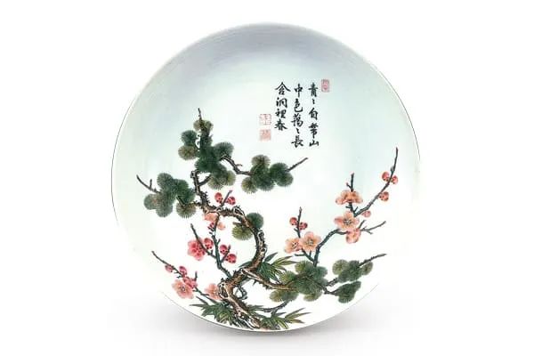 清雍正 · 珐琅彩岁寒三友图盘此器以珐琅料绘画岁寒三友图,空白处题写诗句并加上三印,具有文人诗书画之韵致。(图二)