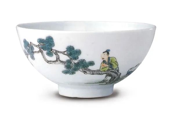 清雍正 · 五彩人物纹碗此器以褐、绿、蓝、黑等低温彩料绘画釉上纹饰,笔触精细,配色清雅,风格颇为俊秀。(图三)