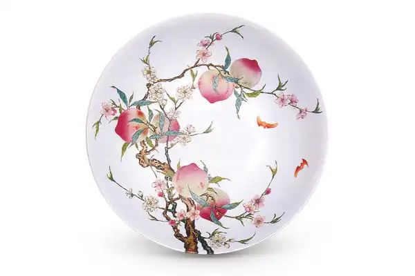例如图五为清雍正时期的粉彩九桃过墙盘,此器呈敞口、浅腹、弧壁、圈足之状,圈足内部亦有“大清雍正年制”青花楷书款。盘面绘画一株桃树,枝叶由盘内延伸到盘外,俗称“过墙花”或“过枝花”,是雍正时期兴起的纹样。