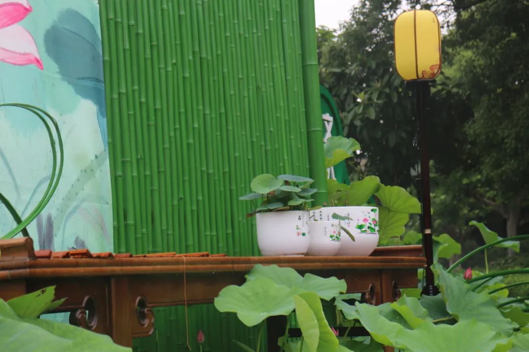 主题花坛北侧的园路广场处变成了文化长廊,大小不一的荷花盆景,掩盖不了两侧案桌上摆放的文房四宝、咏荷诗词散发出的传统文化气息,在古式宫灯、屏风的点缀下,令人心驰神往,不由得低头赏荷,抬首吟诗。
