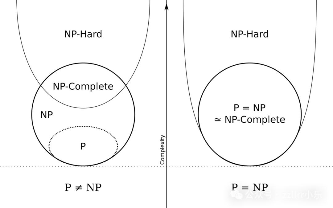 P、NP、NP完全和NP困难等问题集的欧拉图(Euler diagram)。左侧在P ≠ NP的假设下有效,而右侧在P = NP的假设下有效。图源:Behnam Esfahbod