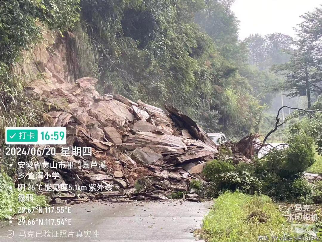 6月20日12时,黄山市祁门县芦溪乡查湾村灾害风险隐患信息报送员李加强、胡亚霖在巡查时发现,该村前往尚田村民组路边山体有碎石滑落现象,且整个山体底部有空洞,随时可能滑坡。2人立即上报,同时拉设警戒线,安排人员在道路两边执勤值守,提醒过往人员注意安全。16时左右,碎石开始持续滑落。
