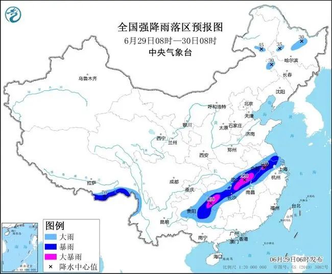 预计,6月29日08时至30日08时,江苏中南部、安徽中南部、湖北中东部、江西北部、湖南中北部、贵州东南部、广西北部及内蒙古东部、黑龙江中部、云南西北部、西藏东南部等地部分地区有大到暴雨,其中,安徽中部、湖北东部、江西西北部、湖南东北部和中部偏西地区、贵州东部等地部分地区有大暴雨(100~220毫米)。上述部分地区伴有短时强降水(最大小时降雨量30~60毫米,局地可超过80毫米),局地有雷暴大风等强对流天气。
