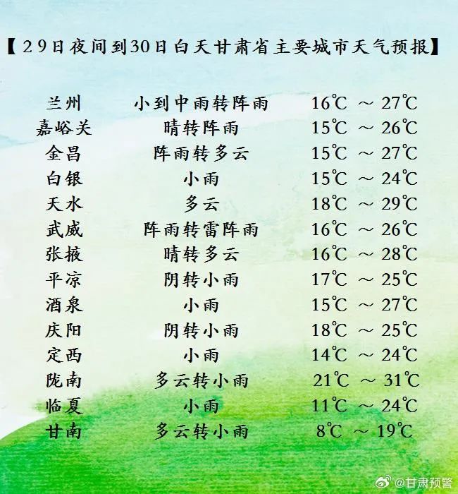 原标题:《29~30日除酒泉西部外,甘肃又将有大范围小雨天气!》