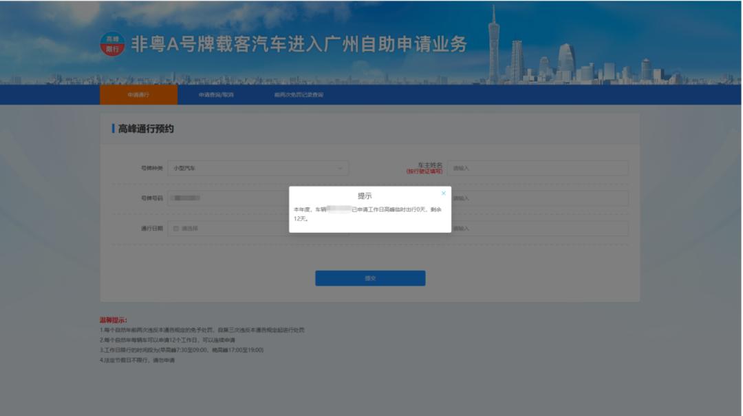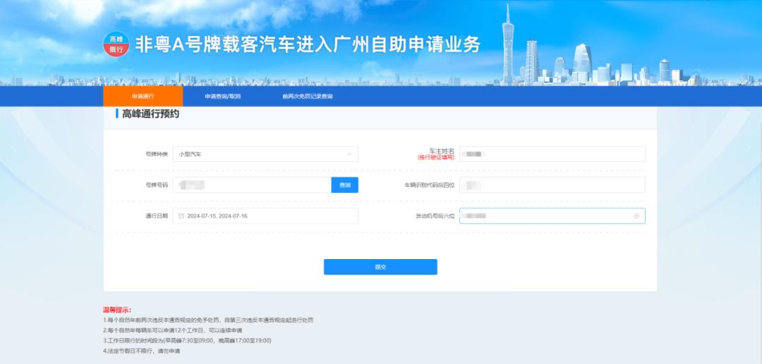 申请通行进入申请通行页面,输入正确的号牌种类、号牌号码、车辆识别代码后四位、发动机号后六位,车主姓名等信息后,选择通行日期,点击提交按钮,确认输入信息无误后点击提交按钮,系统提示申请成功。