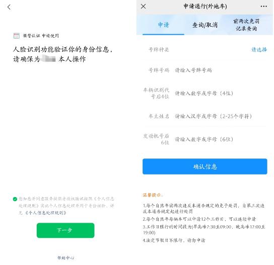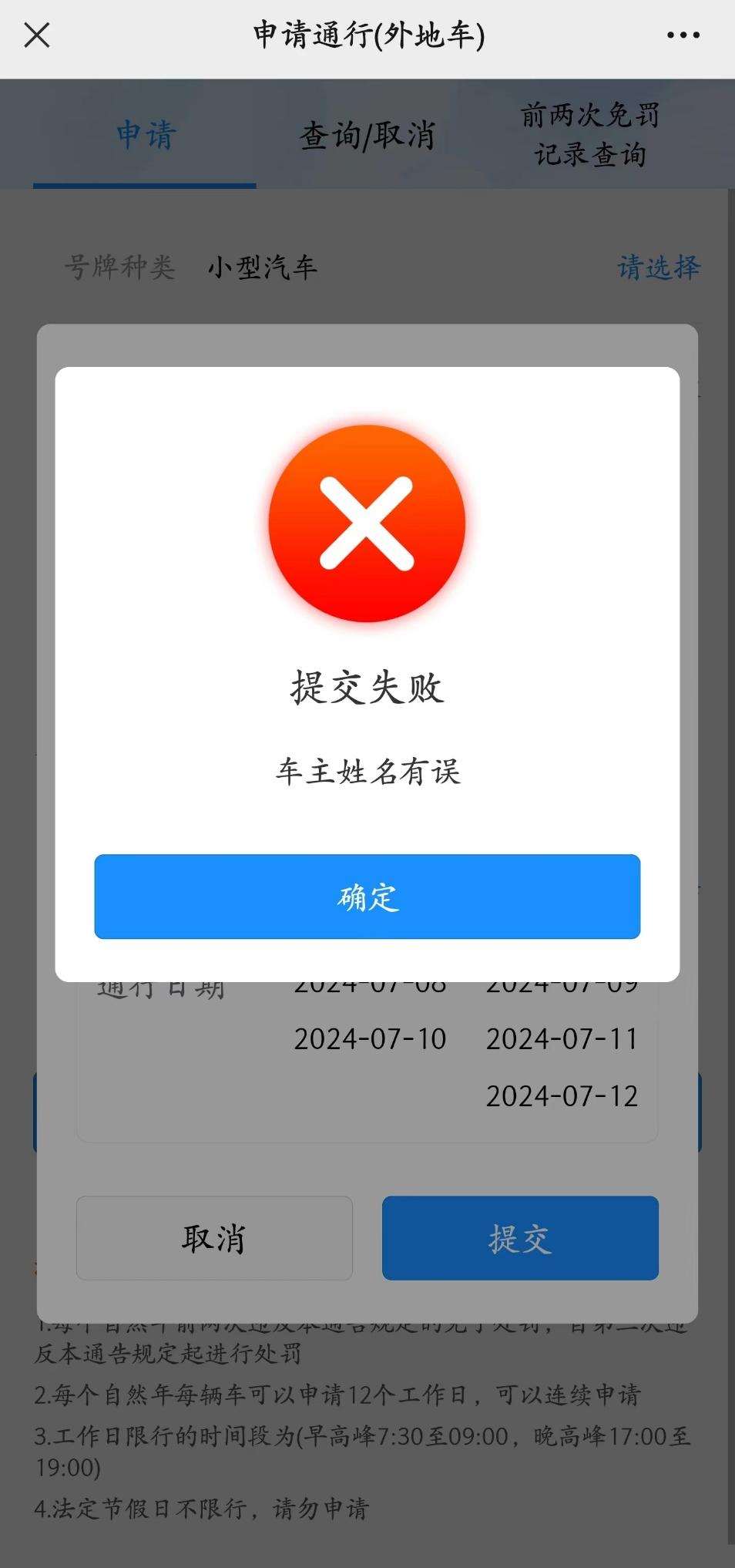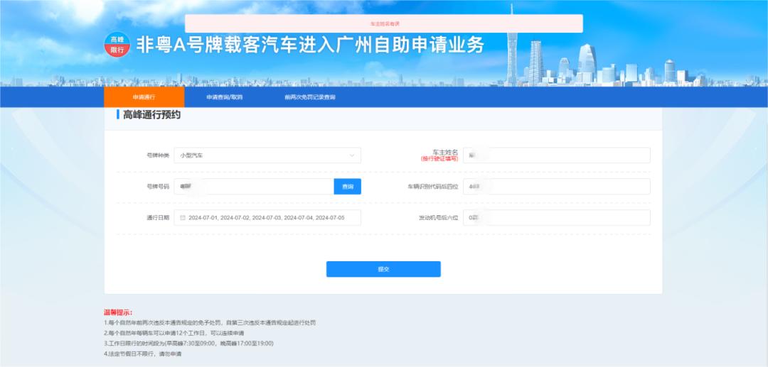 申请通行预约时,会校验车主姓名、号牌号码、车辆识别码后四位、发动机号后六位,若输入有误则无法提交。