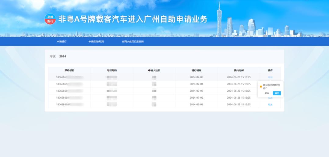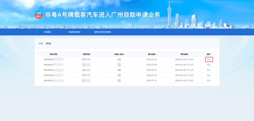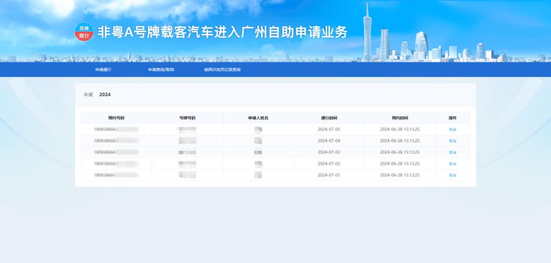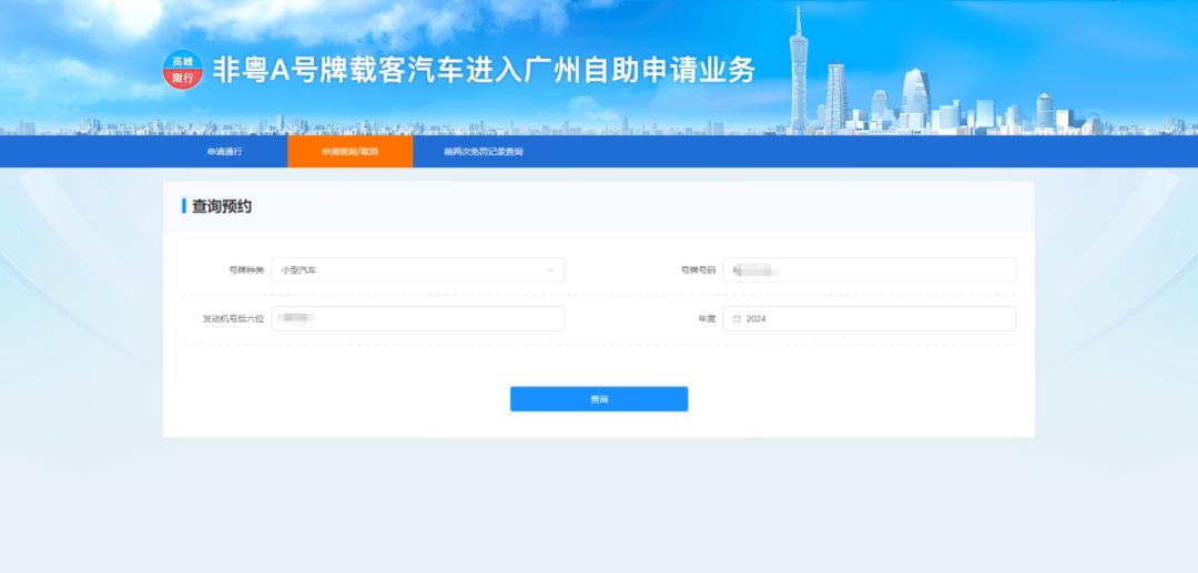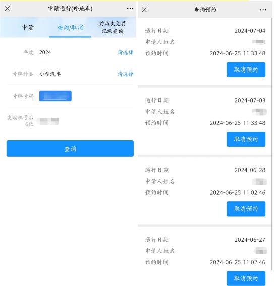 申请查询/取消进入查询页面,填写号牌种类、号牌号码、发动机号后六位、年度,点击查询按钮,列表形式显示对应的预约信息。