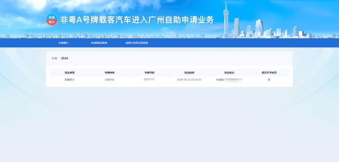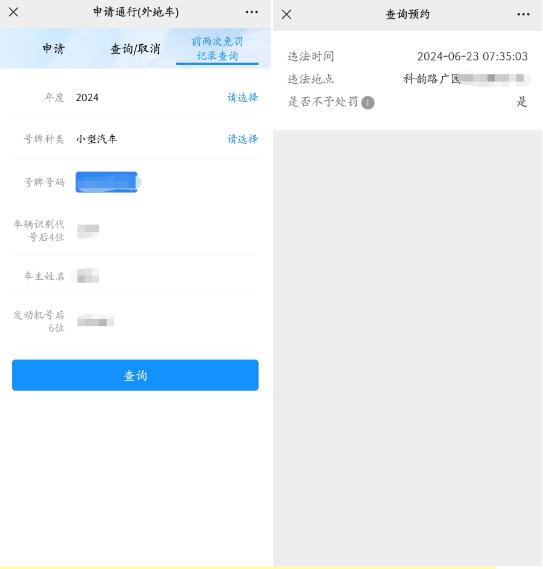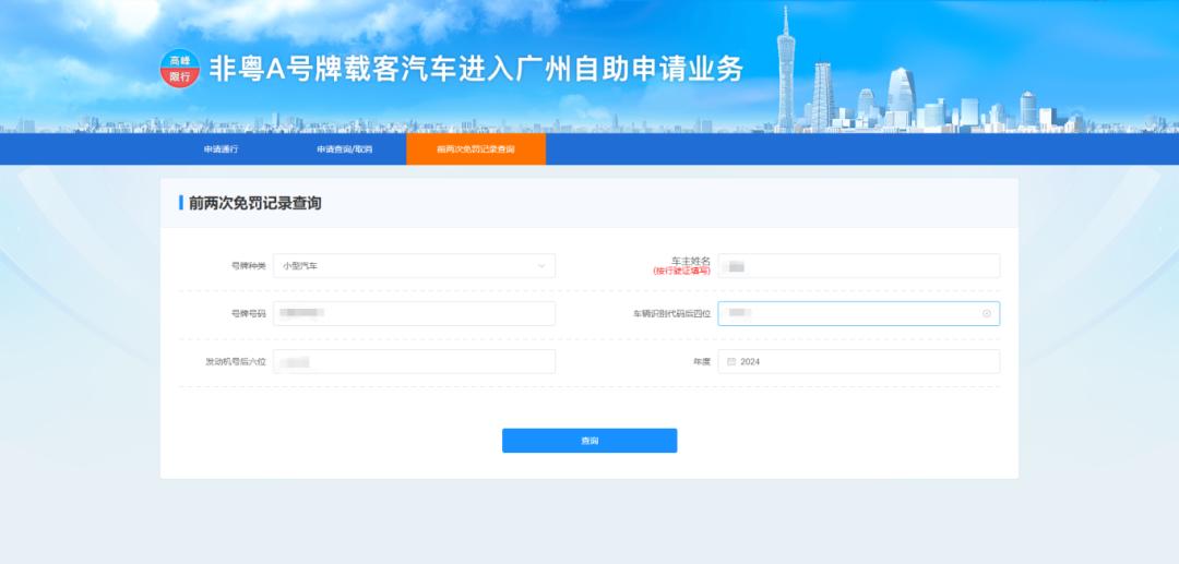 前两次免罚记录查询进入查询页面,输入号牌种类、车主姓名、号牌号码、车辆识别码后四位、发动机号后六位、年度,可查询到对应号牌在对应年度前两次高峰限行免罚记录。